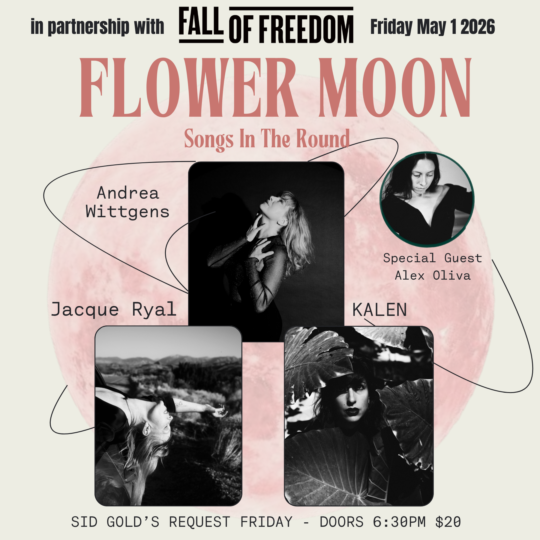 Celebrate the Flower Moon on May 1st with songwriter's KALEN, Jacque Ryal & Andrea Wittgens. This will be a dynamic collaborative set of songs in the round with a dance performances by special guest Alex Oliva.